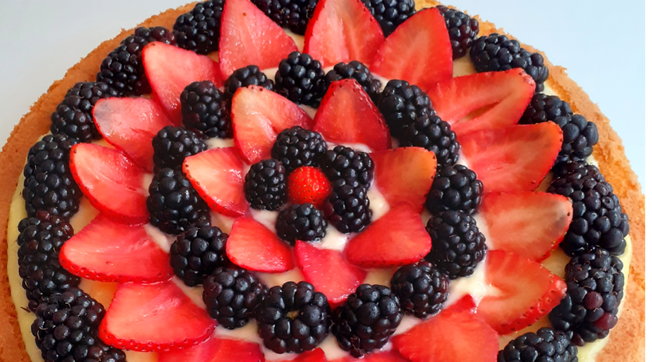 Ora potete assemblare la torta: se volete potete bagnare la base con un po’ di acqua e limoncello. Versate sopra la crema e livellate bene. Poi decorate con fragole e more come più vi piace. Mettete in frigo per una mezz’ora almeno, prima di servire.